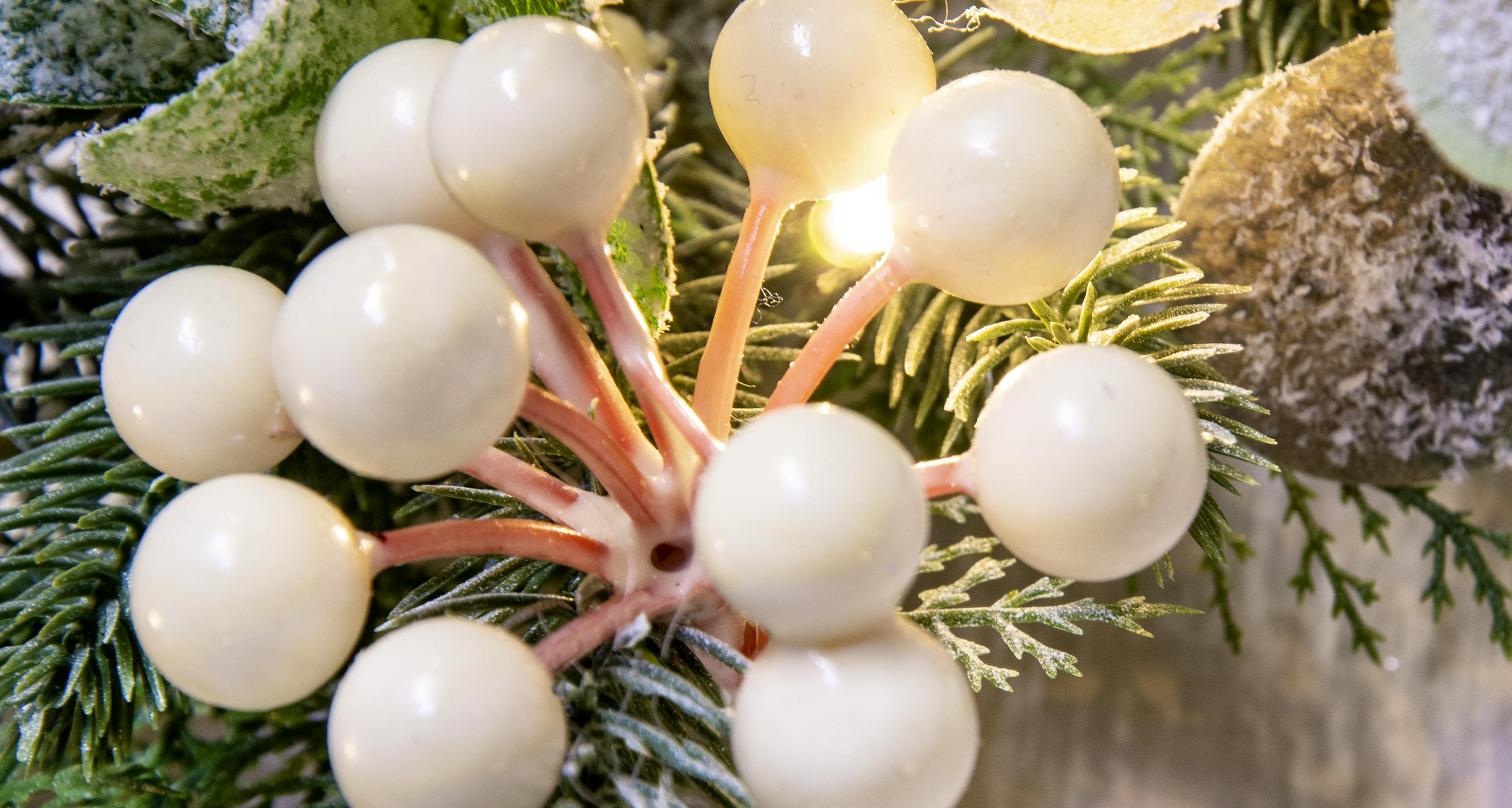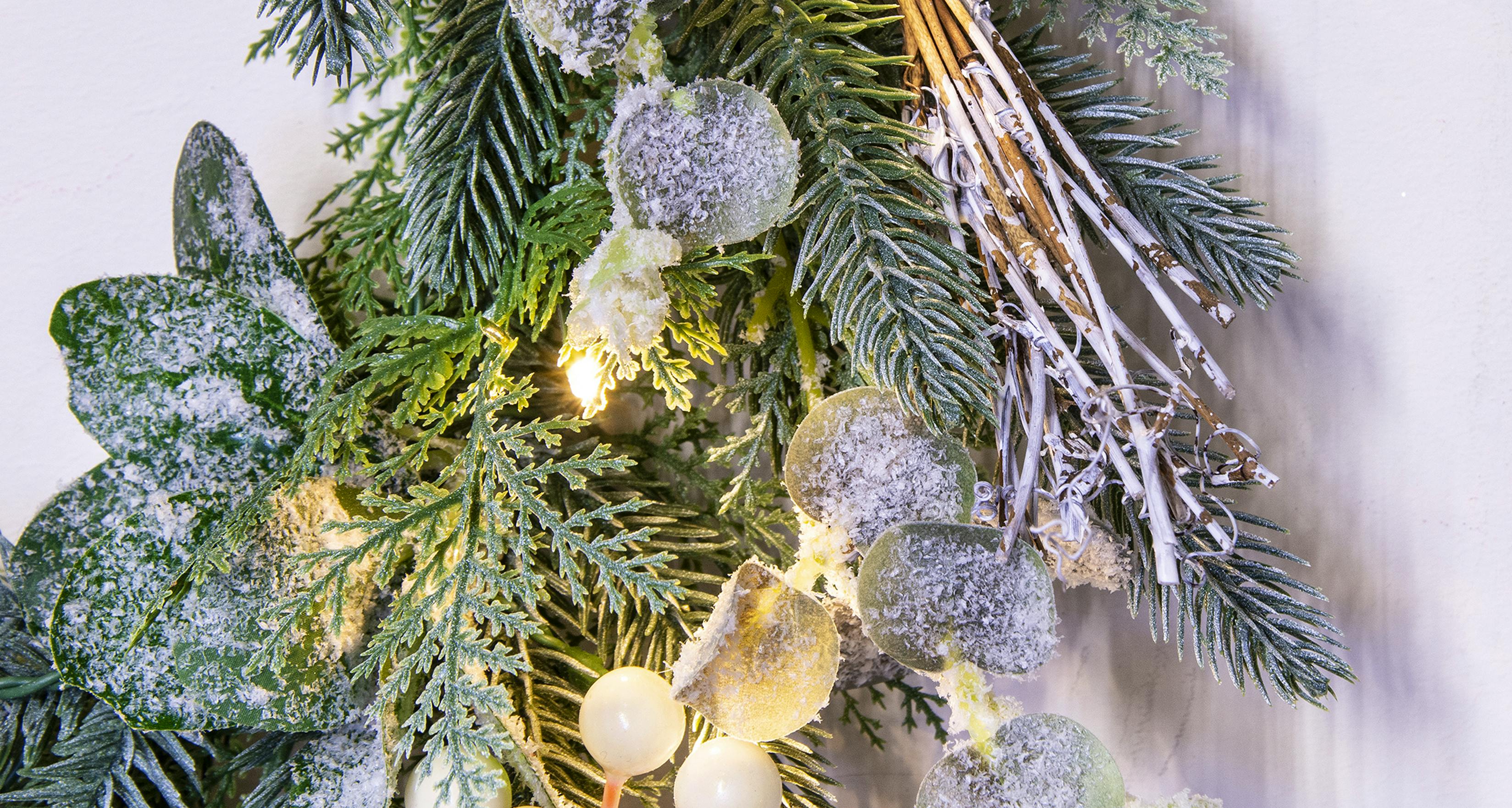 Elegantly arranged with white berries, frost-encrusted eucalyptus, twigs, and warm white Christmas lights, it couldn't be easier to fall in love with this 50cm pre-lit Christmas wreath from Christmas Tree World!