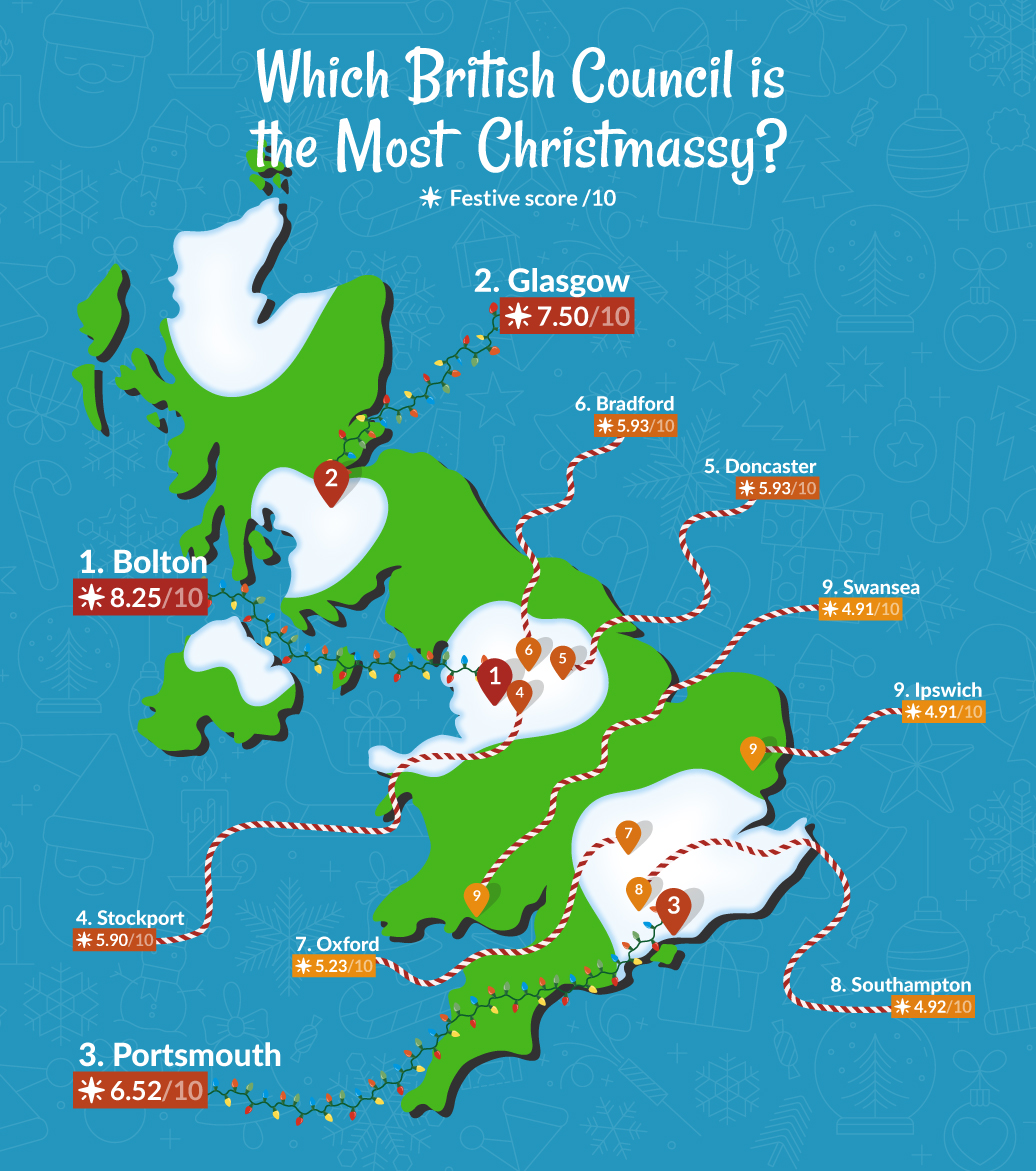 Bolton may not have the largest budget, but it makes the most of what it has. With a spend of £0.37 per person, only slightly higher than the national average, the council still ranked the most festive in Britain overall.
