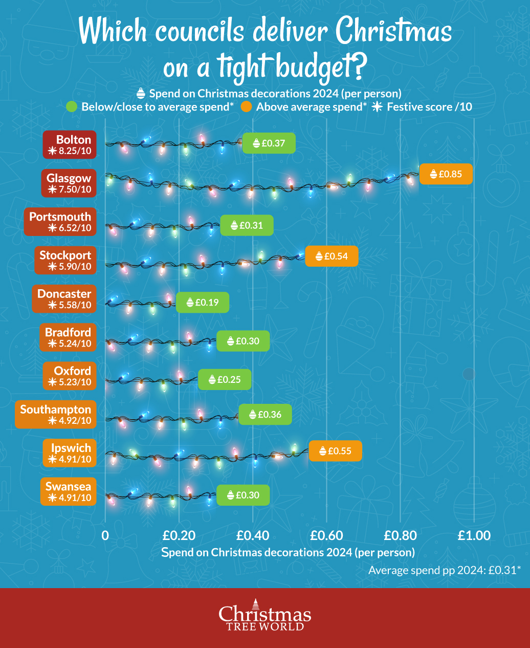 Decorating for the most wonderful time of the year doesn’t have to be expensive. The average council spent £0.31 per person on Christmas decorations in 2024, while those with bigger budgets spent up to £0.85 per person.